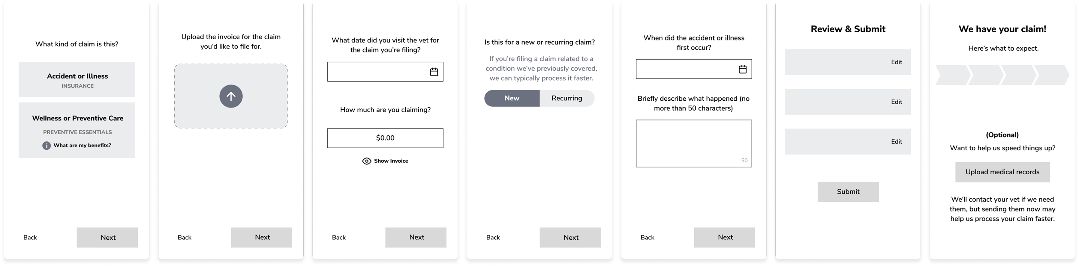 As I moved up in fidelity, I attempted to strike the right balance of helping users see their place in the task of filing a claim, while also helping them focus on the current step in the process.