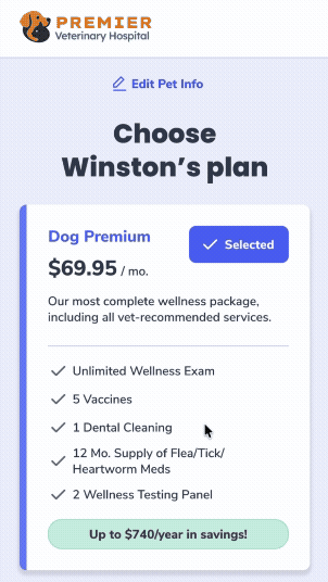 Rather than re-inventing plan selection for Elite, I applied plan-selection insights that had already been validated through user testing. To support long-term consistency across channels, I intentionally reused a shared plan page template designed to work for both veterinary and direct-to-consumer experiences.